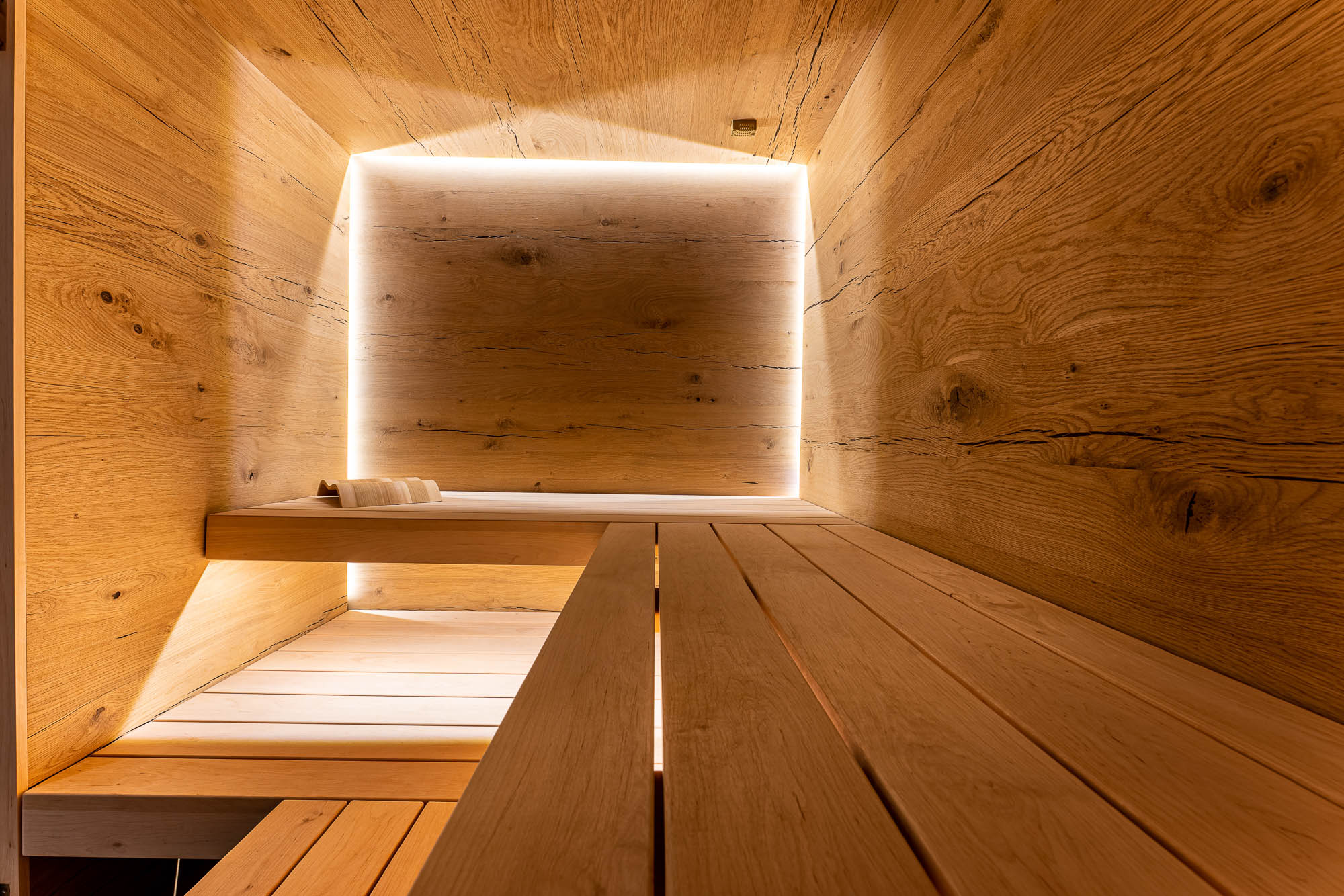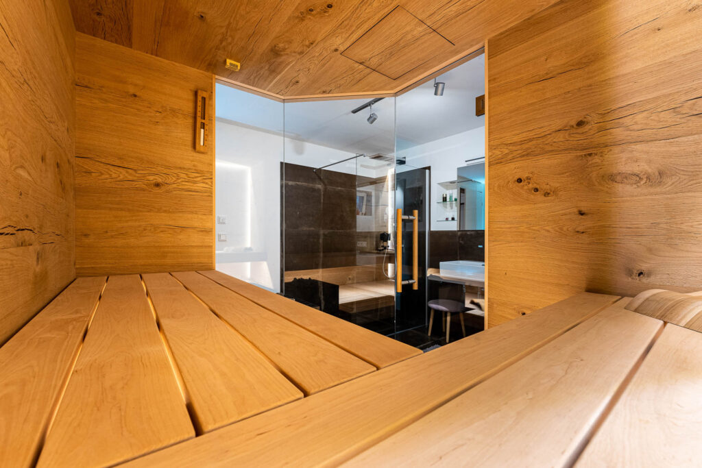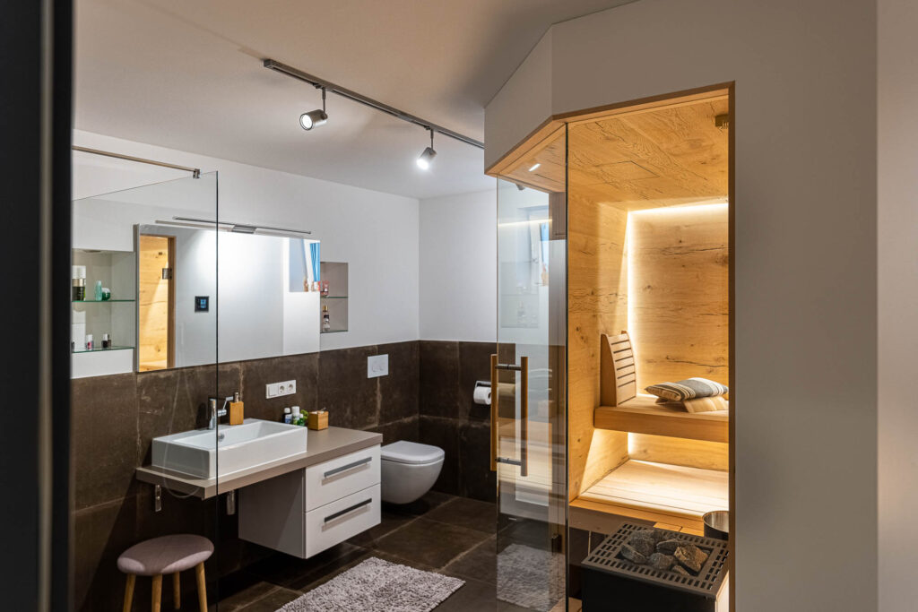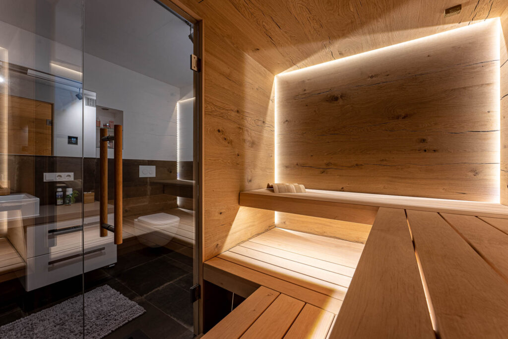 Je nachdem wie hoch Sie die Temperatur in Ihrer Sauna eingestellt haben, kann diese bis zu 100 Grad betragen. Das Saunaholz heizt sich langsam auf und gibt die Wärme allmählich auf angenehme Art wieder in den Innenraum der Sauna ab. Glas hingegen kann keine Feuchtigkeit aufnehmen und strahlt die Hitze daher stark an den Innenraum der Sauna zurück. Die Temperatur fühlt sich dann höher an, als sie tatsächlich ist. Daher ist es wichtig, dass man nicht zu viel Glas verbaut, denn die Sauna an sich „lebt“ ganz einfach vom Holz und seinen angenehmen, natürlichen Eigenschaften. Es kommt also auf ein ausgewogenes Verhältnis an, damit das Saunieren angenehm und entspannend bleibt. Als Faustregel gilt ein gutes Verhältnis von 2/3 Holz zu 1/3 Glas.